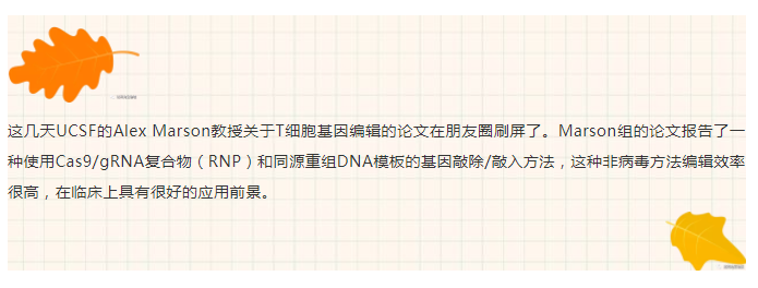 文章的共同通訊作者為密西根大學(xué)的徐捷教授和康奈爾大學(xué)的夏曉峰教授。這篇文章和Marson組文章的共同點(diǎn)是都使用電轉(zhuǎn)Cas9RNP的方法在一些之前認(rèn)為很難編輯的細(xì)胞上取得了很高的同源重組效率。Marson實(shí)驗(yàn)室的研究更加深入,在免疫治療上幾個(gè)重要的基因位點(diǎn)做了基因編輯的研究,不僅對于CAR-T可能有很大幫助,對于TCR-T的制備可能也有重要意義。