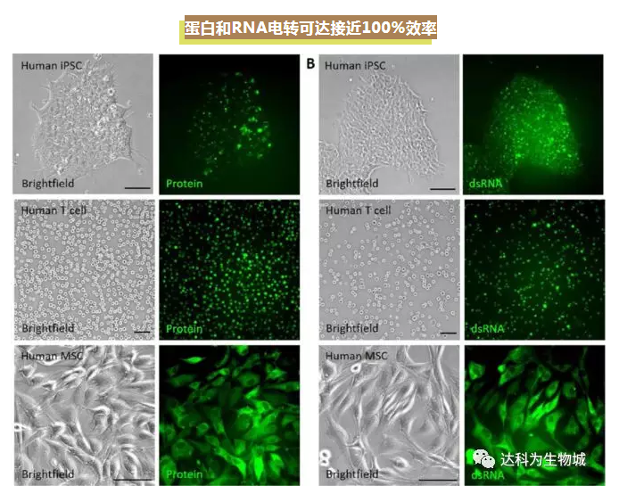 徐、夏兩個(gè)實(shí)驗(yàn)室主要從事干細(xì)胞和轉(zhuǎn)基因動(dòng)物模型研究,因此對于基因編輯主要著眼在方法學(xué)上,力爭使基因編輯高效并且簡單,可以普遍性地應(yīng)用于各種細(xì)胞上。相比于Marson組的文章,徐、夏這篇文章還報(bào)道了在除了T細(xì)胞之外的多種細(xì)胞包括iPSC干細(xì)胞,MSC間充質(zhì)干細(xì)胞,以及一些細(xì)胞系上取得的良好效果。