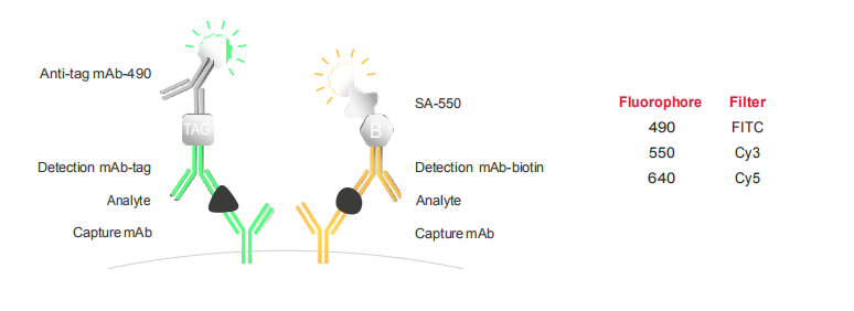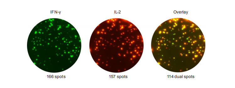 FluoroSpot能夠分析抗原特異性的多功能T細胞,例如,IFN-γ和IL-2的分析。三明治夾心結(jié)構(gòu)在熒光斑點中得以應(yīng)用,不同特異性的單克隆捕獲抗體混合物被包被于96孔板的PVDF膜上,生物素標(biāo)記的檢測抗體識別一種分泌物,tag標(biāo)記的檢測抗體識別其它的分泌物來實現(xiàn)雙色或三色細胞因子分泌細胞的檢測。檢測通過帶有特定熒光基團的共軛試劑放大信號斑點,可用自動讀板器進行分析。
