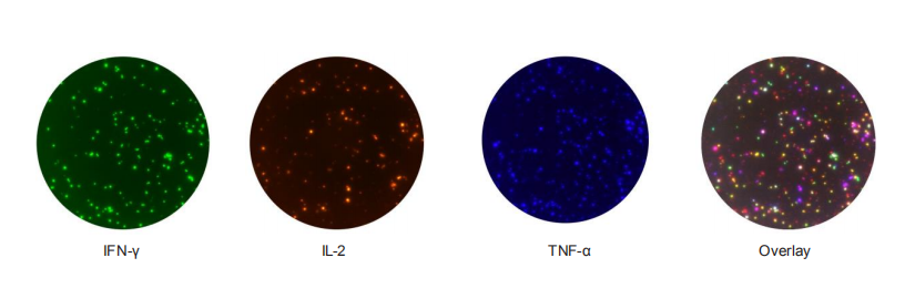 三色 FluoroSpot分析總共可以顯示7個亞群:3個單染的細胞因子,3個雙染的細胞因子,1個三色的細胞群。圖像顯示的是一個三色FluoroSpot分析結(jié)果。用一組病毒肽(CEF)刺激人的外周血單個核細胞(PBMC),分別用FITC標(biāo)記IFN-γ、CY3標(biāo)記IL-2和CY5標(biāo)記TNF-α。Overylay展示的是三個指標(biāo)疊后得到的結(jié)果。
