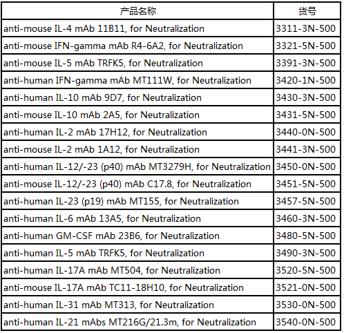 Mabtech除了ELISpot、ELISA相關(guān)檢測產(chǎn)品外,還提供人、小鼠等多種指標的中和抗體;并且Mabtech的中和抗體均為單克隆抗體,不含疊氮化鈉,且內(nèi)毒素含量均低于10 EU/mg。