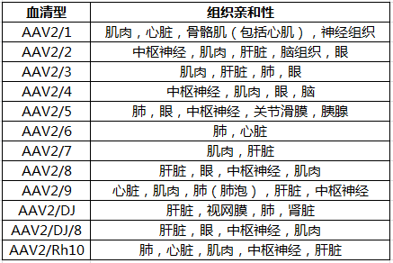 目前發現的AAV有AAV1~AAV11、DJ等12種不同的血清型,主要區別在于衣殼蛋白Cap的不同,并決定不同血清型AAV對不同的組織和細胞有不同的感染效率。