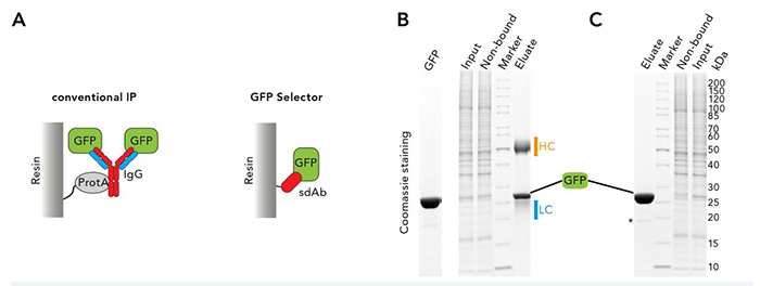 GFP selector是一種新穎的高品質樹脂,用于高效、可重復的GFP融合蛋白免疫沉淀。GFP selector含單域抗體(single-domain antibody,sdAb),可識別GFP及其衍生物,具有高特異性和pmol級親和力。重要的是,GFP融合蛋白可以從GFP selector洗脫而不被抗體重鏈或輕鏈污染(見圖1 C),因此可以輕易地鑒定與GFP融合蛋白特異性結合的蛋白。