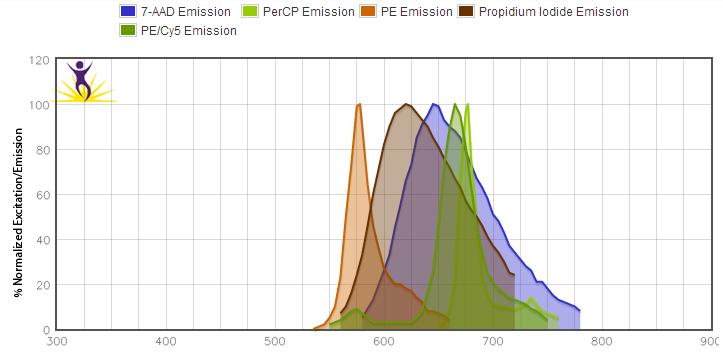 7-AAD、PerCP、PE、PI、PE/Cy5發射光譜: