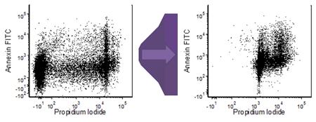 圖為:體外培養一天的C57BL/6小鼠脾細胞做Annexin V/PI染色的流式數據。其中,左邊為未經固定處理的細胞上機檢測結果;右邊為經過70%EtOH, 1.5%PFA固定處理的細胞上機檢測結果。