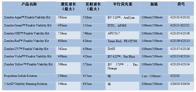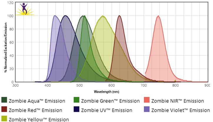Zombie Dyes有別于PI和7-AAD等DNA染料,它是一種可用于需固定細胞實驗的染料,通過與細胞上蛋白質的氨基結合來實現。因活細胞可排除染料,所以僅細胞膜被著色;而死細胞的細胞膜及細胞質均被著色,繼而根據熒光信號的強弱來區分死/活細胞。而且Zombie Dyes可選擇性多,可以由不同的激發光激發,便于靈活選擇。