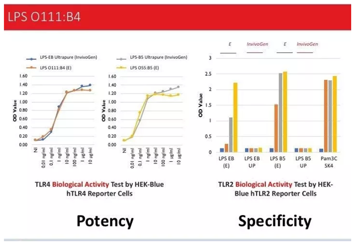 比較InvivoGen和E品牌TLR4特異性LPS(Utrapure)發現,E品牌雖然號稱TLR4 specific agonist,但是可同時激活TLR2和TLR4,而InvivoGen的Ultrapure LPS只能特異性激活TLR4。