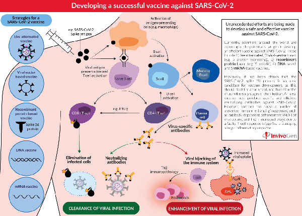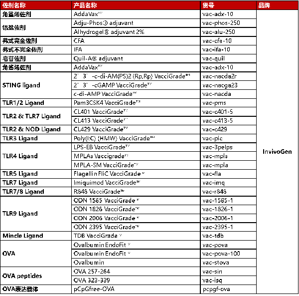 當前,針對COVID-19的疫苗研發以前所未有的速度在世界范圍內陸續開展,世界各地的科學家正在探索開發針對SARS-CoV-2的有效疫苗的所有潛在策略。大多數用于COVID-19的候選疫苗旨在誘導針對病毒S蛋白的中和抗體,防止病毒通過人ACE2受體攝取從而阻止感染。COVID-19疫苗開發前景的顯著特征是正在評估的技術平臺的多樣性,包括:減毒活疫苗,基于病毒載體的疫苗,基于重組蛋白的疫苗,DNA疫苗和RNA疫苗。其中重組蛋白疫苗通常使用SARS-CoV-2蛋白(例如S蛋白)在宿主中引起免疫反應。通常與佐劑結合使用以提高免疫原性。迄今為止,已進入臨床試驗的COVID-19候選疫苗包括Moderna開發的mRNA疫苗(NCT04283461)和康希諾 (NCT04341389)開發的重組腺病毒疫苗。此外,諸如AS03和MF59等佐劑正在重組蛋白疫苗中進行探索,使用佐劑可增強免疫原性并降低劑量,使更多人接種疫苗成為可能。天然免疫專家InvivoGen提供科研用途的佐劑和OVA產品供研究人員選擇。