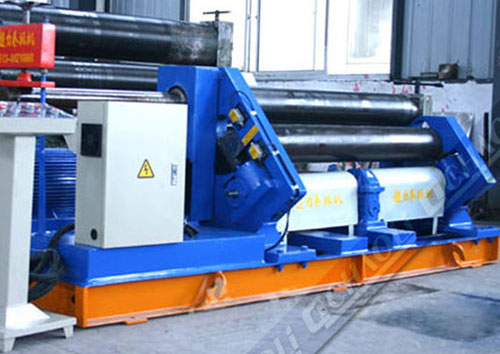 該機結構型式為三輥非對稱式,下輥為主傳動,并做垂直升降運動,以便夾緊板材。通過下輥齒輪與上輥齒輪嚙合,同時作為主傳動,側輥作傾升降運動。具有預彎、卷圓多重功能,結構緊湊操作維修方便。